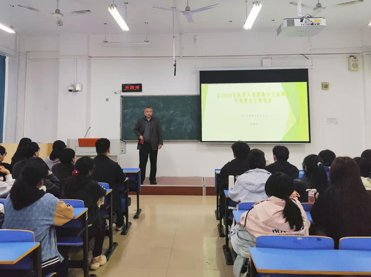 为严格落实学校党委发展党员工作部署,切实加强入党积极分子培养教育,筑牢理论根基、提升政治素养,确保新党员发展质量,10月14日下午,我院2025年秋季入党积极分子培训班开班典礼在龙子湖校区启智楼208教室举行。32名学生入党积极分子参训,学院党总支、学生党支部主要负责同志和院党员服务站成员出席典礼。